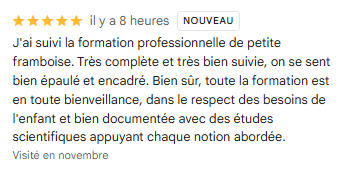 Je recommande la formation sommeil d’Alexia à tous les professionnels de santé qui souhaitent comprendre véritablement le sommeil de l’enfant. Elle donne énormément d’infos théoriques mais aussi pratiques, ce qui n’est pas le cas de beaucoup de formations. J’ai apprécié sa disponibilité et ses valeurs. A la fin de la formation, je me suis sentie prête à accompagner les parents.